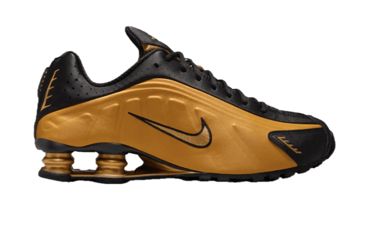 The Nike Shox R4 is back to reclaim its title as the most audacious silhouette on the streets. This 'Metallic Gold' edition takes the R4’s space-age aesthetic to a whole new level, draping the futuristic design lines in a high-shine trophy finish.